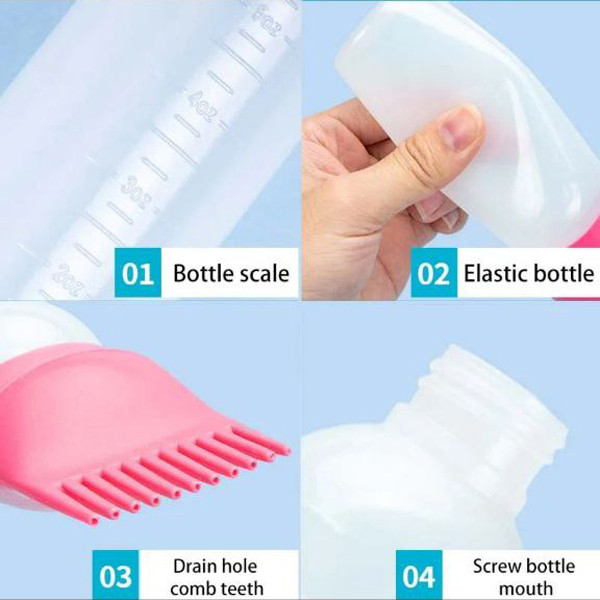 اپلیکاتور روغن مو از پلاستیک و مواد با کیفیت بالا ساخته شده است، برس بطری سبک وزن است و حمل آن آسان است، محصولات رنگ مو قابل شستشو و استفاده مجدد هستند * درب بطری اپلیکاتور شانه مو مانند یک شانه طراحی شده است. اپلیکاتور روغن راحتی زیادی برای رنگ کردن موهای خود در خانه برای شما فراهم می کند و نیازی به نگرانی در مورد هدر رفتن رنگ ندارد. فقط کافیست رنگ مو را داخل بطری اپلیکاتور مو بریزید، بطری اپلیکاتور را به چپ و راست تکان دهید تا رنگ یکنواخت شود، سپس بطری رنگ مو را فشار دهید تا رنگ جریان پیدا کند. از طریق شانه موها را به طور مساوی شانه کنید. (هنگام استفاده از اپلیکاتور شانه ریشه دستکش بپوشید تا از کثیف شدن دستهایتان جلوگیری شود) اپلیکاتور بطری روغن مو را میتوان در موارد زیادی استفاده کرد.