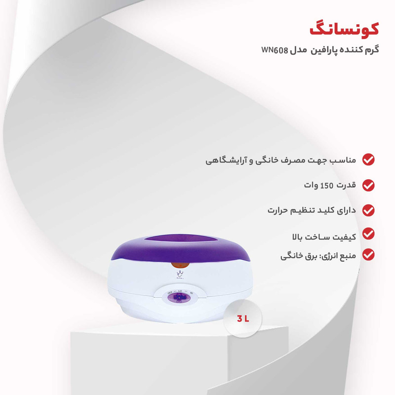کیفیت ساخت بالامناسب جهت مصرف خانگی و آرایشگاهدارای حجم 3 لیتردارای قدرت 150 واتکلید تنظیم حرارت