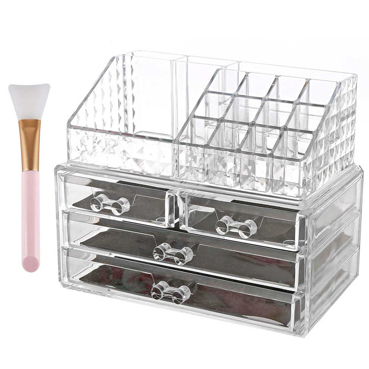 استند لوازم آرایشی 4 کشو با رویه الماسی قابل شستشو (فقط از ابر برای شستشو استفاده کنید و از وسایل زبر برای شستن استفاده نکنید) جنس اکرولیک شفاف