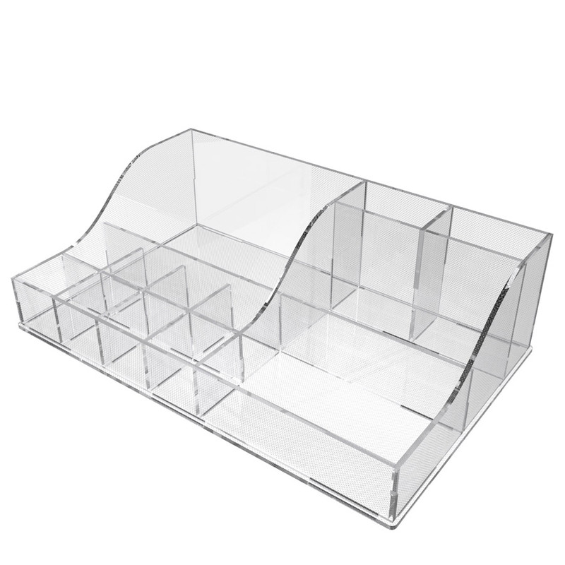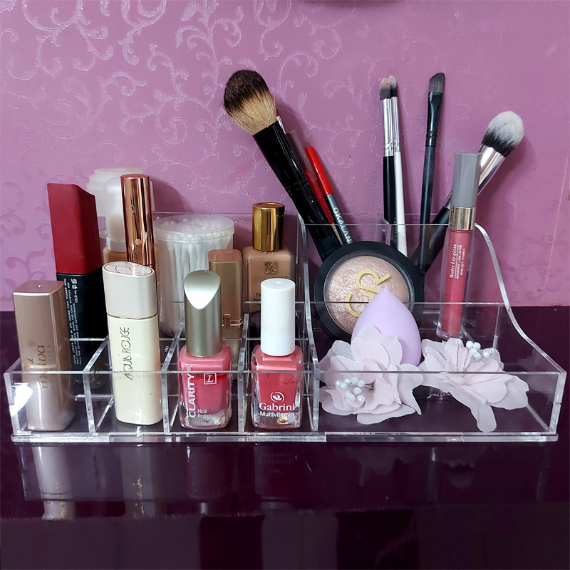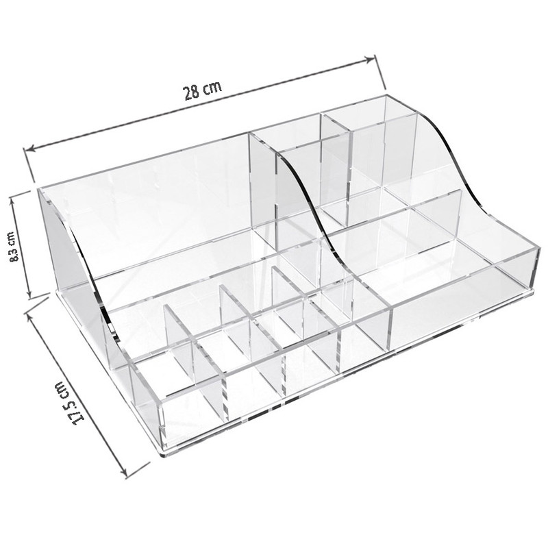 بر هیچ کس پوشیده نیست که نظم و ترتیب عامل آرامش و افزایش راندمان کاری است. استند آرایشی راشا در ابعاد 28x18x8 سانتی متر بسیار جادار بوده که امکان منظم کردن میز آرایش یا میز کار شما را به ساده ترین نحو میسر می سازد. این محصول از مواد اکریلیک بسیار با کیفیت در دو طرح شفاف و شفاف مات (شفاف طرح دار) عرضه می گردد.